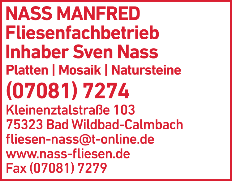 Die Adresse von Nass Manfred Inh. Sven Nass Fliesenfachbetrieb lautet: Kleinenztalstr. 103, 75323 Bad Wildbad
