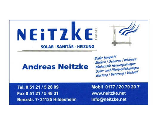 Die Adresse von Neitzke GmbH Sanitär und Heizung lautet: Benzstr. 7, 31135 Hildesheim