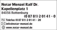 Die Adresse von Notar Menzel Ralf Dr. lautet: Kapellenplatz 1, 84056 Rottenburg
