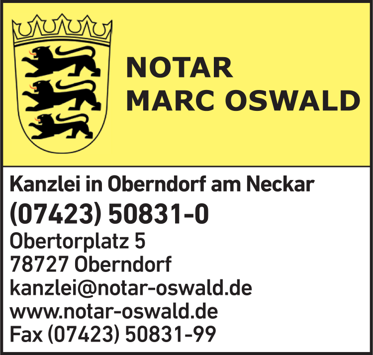 Die Adresse von Notar Oswald Marc lautet: Obertorplatz 5, 78727 Oberndorf