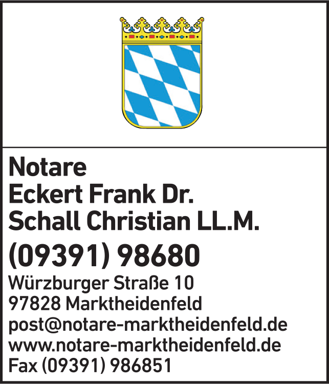 Die Adresse von Notare Dr. Frank Eckert & Christian Schall LL.M. lautet: Würzburger Str. 10, 97828 Marktheidenfeld