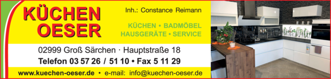 Constance Reimann vom Küchenstudio Oeser in Groß Särchen freut sich über Ihr Interesse! Das Küchenstudio Oeser ist ein modernes Fachgeschäft und Handwerksunternehmen mit breitem Leistungsangebot. So finden Sie bei Oeser neben Küchen auch Hausgeräte, Möbel, Küchenzubehör und einzelne Arbeitsplatten. Das Team berät Sie gern, welches Modell für Ihren Bedarf optimal geeignet ist. Daneben gehören handwerkliche Dienstleistungen von der Küchenplanung bis hin zum Aufbau Ihrer Traumküche zum Leistungsspektrum. Besuchen Sie das Fachgeschäft in Groß Särchen und werfen Sie einen Blick auf die dortigen Musterküchen, um Inspirationen zu erhalten. Das Personal führt Ihnen gerne vor, über welche Eigenschaften die jeweiligen Küchen verfügen.