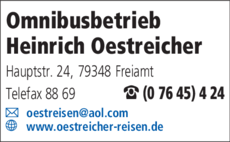 Die Adresse von Oestreicher Heinrich lautet: Hauptstr. 24, 79348 Freiamt