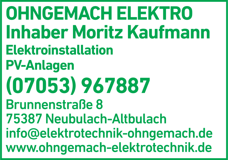 Die Adresse von Ohngemach Elektro, Inh. Moritz Kaufmann lautet: Brunnenstr. 8, 75387 Neubulach-Altbulach