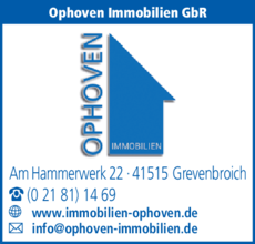 Die Adresse von Ophoven Immobilien Gbr lautet: Am Hammerwerk 22, 41515 Grevenbroich