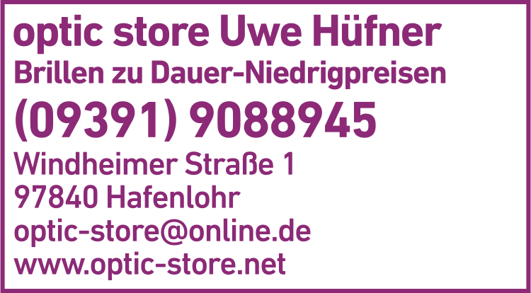 Die Adresse von Optic-Store Uwe Hüfner lautet: Windheimer Str. 1, 97840 Hafenlohr