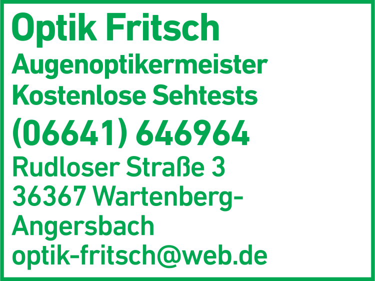 Die Adresse von Optik Fritsch Augenoptikermeister lautet: Rudloser Str. 3, 36367 Wartenberg