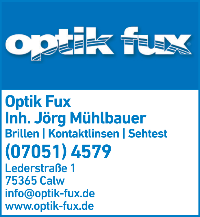 Die Adresse von Optik Fux Inh. Jörg Mühlbauer lautet: Lederstr. 1, 75365 Calw
