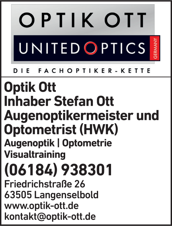 Die Adresse von Optik Ott lautet: Friedrichstr. 26, 63505 Langenselbold