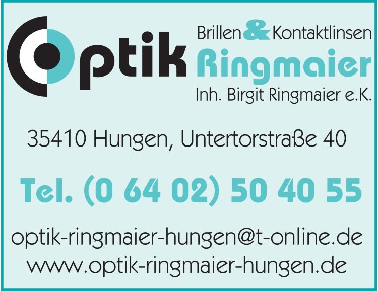 Die Adresse von Optik Ringmaier lautet: Untertorstr. 40, 35410 Hungen