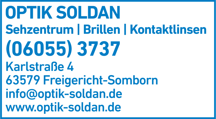 Die Adresse von Optik Soldan Sehzentrum lautet: Karlstr. 4, 63579 Freigericht