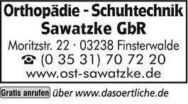 Orthopädie-Schuhtechnik Sawatzke GbR 03531 70 72 20 Finsterwalde Moritzstr. 22 03238 https://media.roeser-online.de/02/219/LOGO/000/381/249_200x100.png 5 5 1