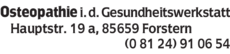 Die Adresse von Osteopatie i. d. Gesundheitswerkstatt lautet: Hauptstr. 19 A, 85659 Forstern