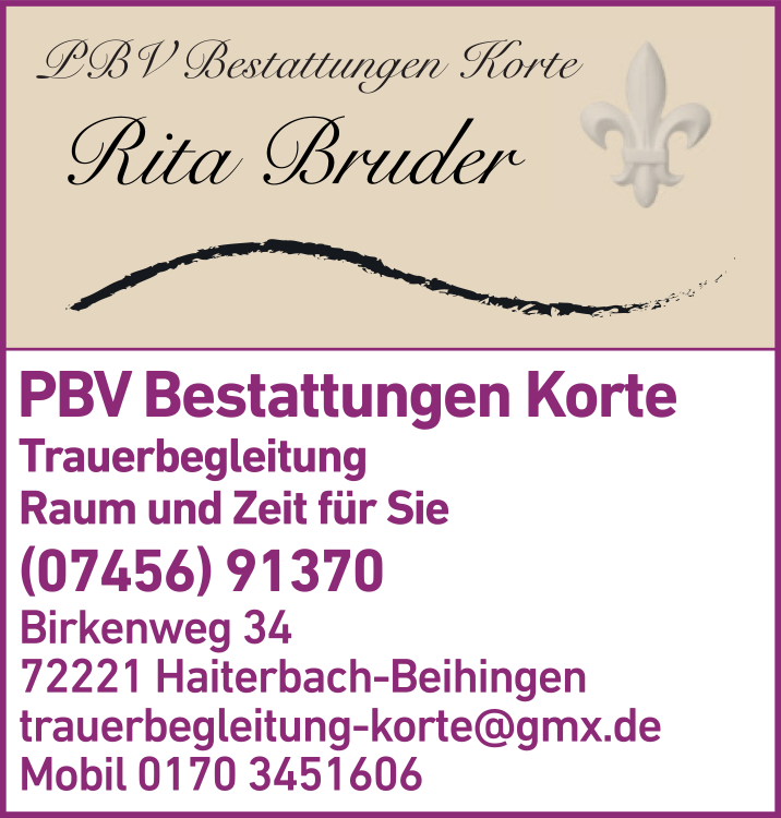Die Adresse von PBV Trauerbegleitung Korte lautet: Birkenweg 34, 72221 Haiterbach-Beihingen