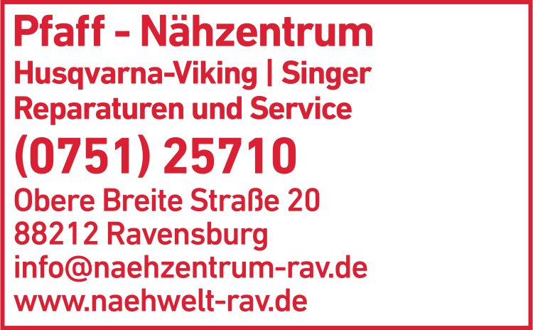 Die Adresse von PFAFF - Nähzentrum C.M. Warth GmbH lautet: Obere Breite Str. 20, 88212 Ravensburg