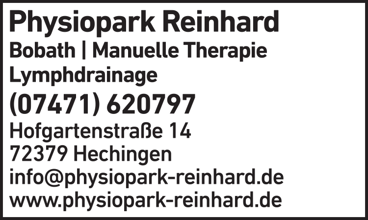 Die Adresse von PHYSIOPARK REINHARD, Philip Reinhard lautet: Hofgartenstr. 14, 72379 Hechingen