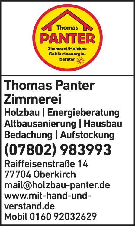 Die Adresse von Panter Thomas Zimmerei lautet: Raiffeisenstr. 14, 77704 Oberkirch
