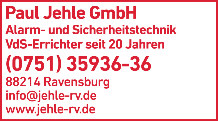 Die Adresse von Paul Jehle GmbH lautet: 88214 Ravensburg