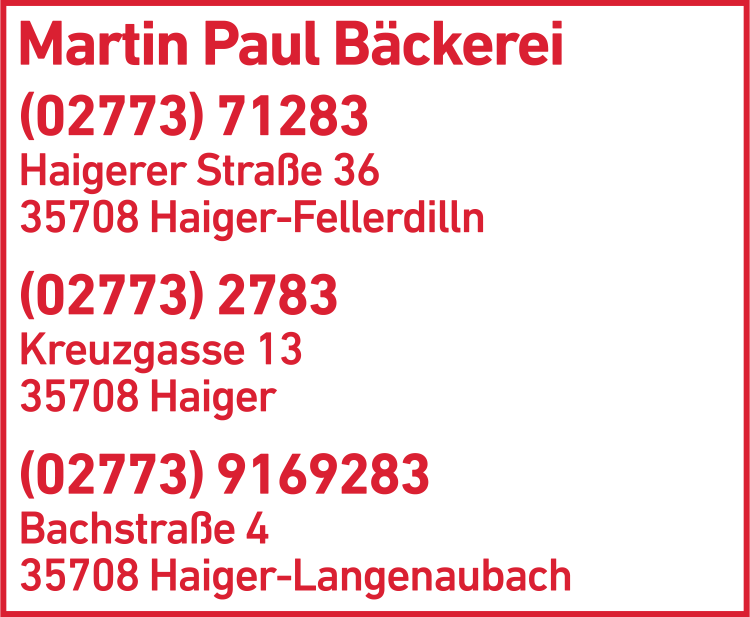 Paul Martin Bäckerei 02773 7 12 83 Haiger-Fellerdilln Haigerer Str. 36 35708 Fellerdilln