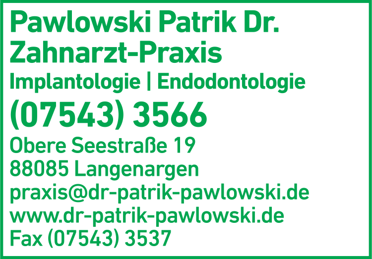 Die Adresse von Pawlowski Patrik Dr. Zahnarzt lautet: Obere Seestr. 19, 88085 Langenargen