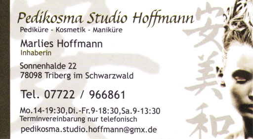 Die Adresse von Pedikosma Studio Hoffmann lautet: Sonnenhalde 22, 78098 Triberg