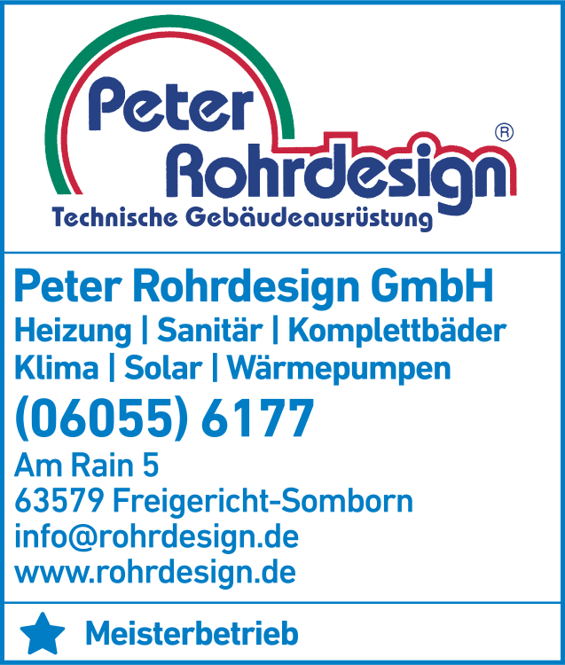 Die Adresse von Peter Rohrdesign GmbH lautet: Am Rain 5, 63579 Freigericht