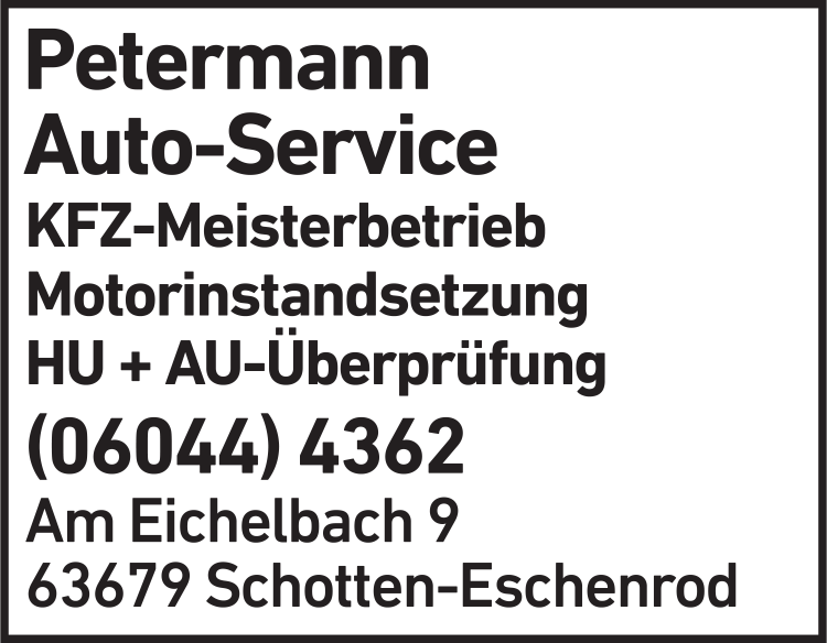Die Adresse von Petermann Auto-Service lautet: Am Eichelbach 9, 63679 Schotten-Eschenrod