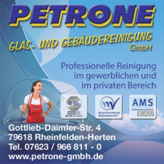 Petrone Glas- und Gebäudereinigung GmbH 07623 96 68 11-0 Rheinfelden Gottlieb-Daimler-Str. 4 79618 Herten https://ies.v4all.de/0122/OETB/0136/6/9336/70259336_200x100px.png 4 5 7