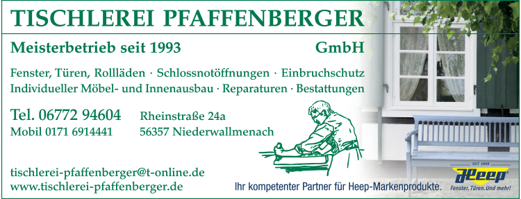Die Adresse von Pfaffenberger GmbH Tischlerei lautet: Rheinstr. 24 A, 56357 Niederwallmenach