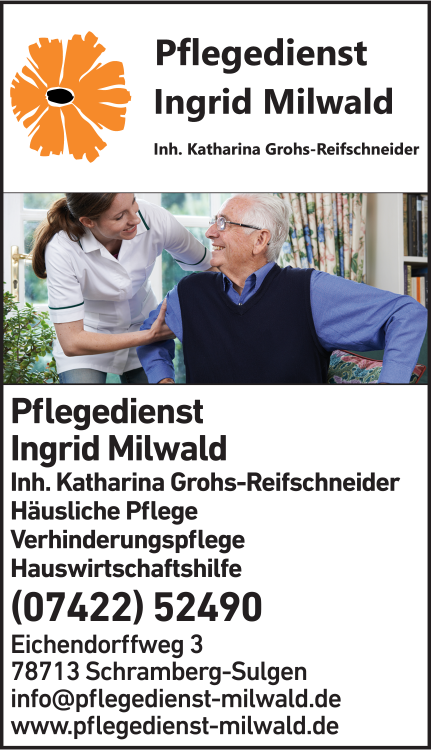 Die Adresse von Pflegedienst Ingrid Milwald Inh. Katharina Grohs-Reifschneider lautet: Eichendorffweg 3, 78713 Schramberg-Sulgen