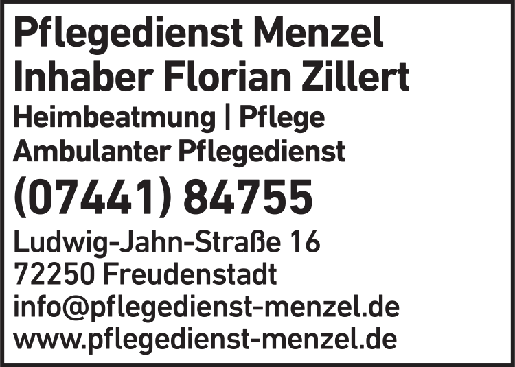 Die Adresse von Pflegedienst Menzel lautet: Ludwig-Jahn-Str. 16, 72250 Freudenstadt