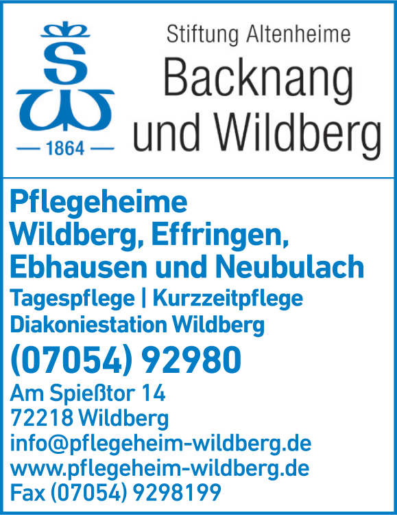 Die Adresse von Pflegeheime Wildberg, Effringen u. Ebhausen lautet: Am Spießtor 14, 72218 Wildberg