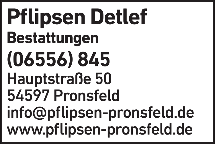 Die Adresse von Pflipsen Detlef Bestattungen lautet: Hauptstr. 50, 54597 Pronsfeld