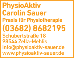 Die Adresse von PhysioAktiv Carolin Sauer Praxis für Physiotherapie lautet: Schubertstr. 18, 98544 Zella-Mehlis