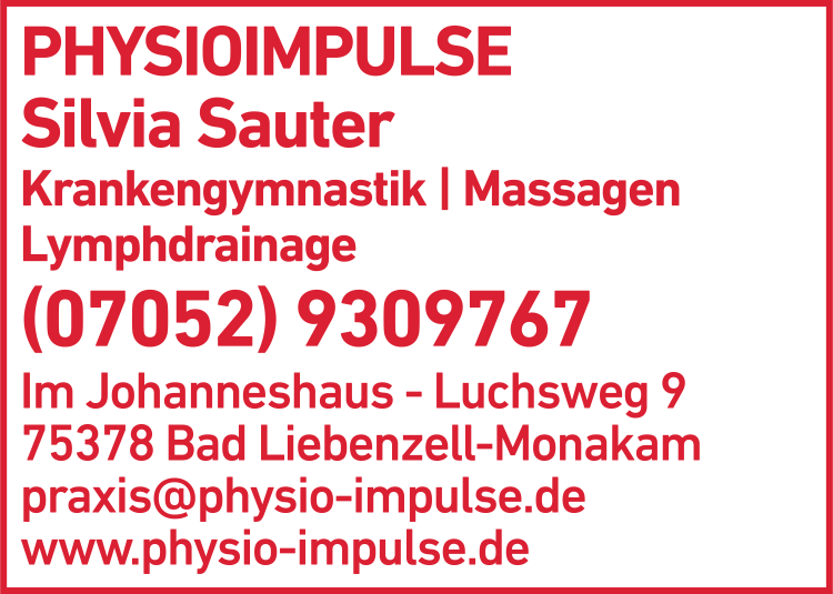 Die Adresse von Physioimpulse lautet: Luchsweg 9, 75378 Bad Liebenzell