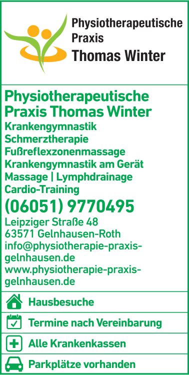Die Adresse von Physiotherapeutische Praxis Thomas WInter lautet: Leipziger Str. 48, 63571 Gelnhausen