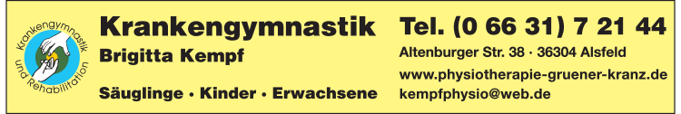 Die Adresse von Physiotherapie-Praxis Grüner Kranz, Brigitta Kempf lautet: Altenburger Str. 38, 36304 Alsfeld