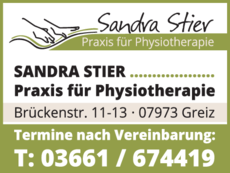 Physiotherapie Sandra Stier 03661 67 44 19 Greiz Brückenstr. 11-13 07973 https://ies.v4all.de/0122/OETB/1129/1/8321/51788321_200x100px.png