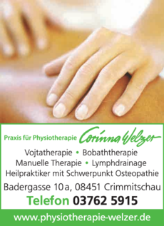 Mit einem geschulten Team erwartet Sie die Physiotherapiepraxis von Frau Corinna Welzer in Crimmitschau. Mit der Manualtherapie werden Schmerzen gelöst und spezielle Mobilisationstechniken angewandt, die Bewegungseinschränkungen entgegenwirken. Besonders nach Operationen kommt die Lymphdrainage zur Anwendung. Dabei wird die reduzierte Pumpfunktion des Gefäßsystems unterstützt und angeregt. Die Physiotherapiepraxis wendet auch die Vojtatherapie bei Kindern an. Nach der Diagnostik werden Haltungsstörungen und Bewegungsstörungen therapiert. Speziell auf die kleinen Patienten ist die Kinderkrankengymnastik ausgelegt. Lassen Sie sich verwöhnen mit einer Fußreflexmassage nach Marquardt. Als manuelle Heilmethode wird ebenfalls in der Praxis die Osteopathie angeboten.