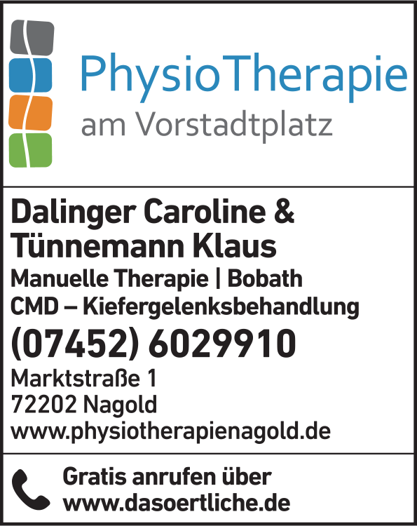 Physiotherapie am Vorstadtplatz Dalinger & Tünnemann 07452 6 02 99 10 Nagold Marktstr. 1 72202 5 5 1