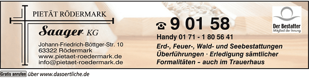 Pietät Rödermark Saager KG bietet Bestatter, Bestattungsunternehmen, Waldbestattungen, Seebestattungen, Erdbestattungen, Beerdigungen, Überführungen, Bestattung, Bestattungen und Beerdigung an.