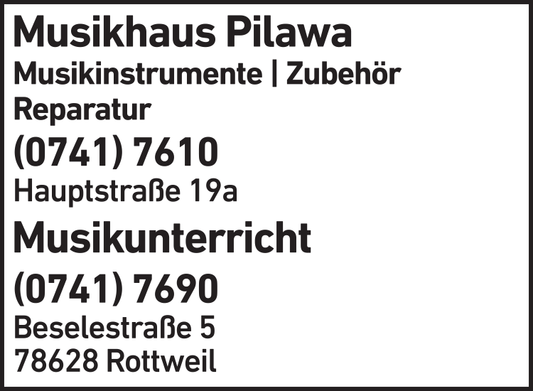 Die Adresse von Pilawa Musikhaus u. Studio lautet: Hauptstr. 19 a, 78628 Rottweil