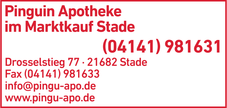 Die Adresse von Pinguin Apotheke im Marktkauf Stade lautet: Drosselstieg 77, 21682 Stade