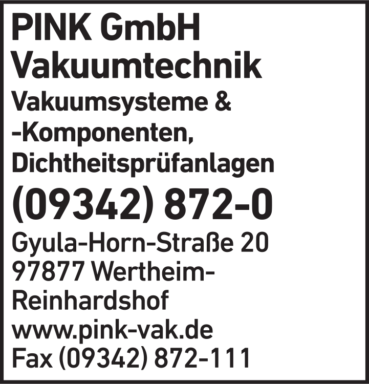 Die Adresse von Pink GmbH Vakuumtechnik lautet: Gyula-Horn-Str. 20, 97877 Wertheim