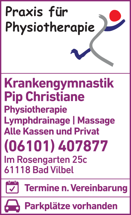 Die Adresse von Pip Christiane Physiotherapie lautet: Im Rosengarten 25 c, 61118 Bad Vilbel