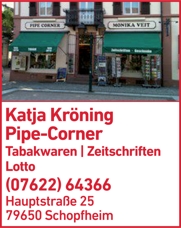 Die Adresse von Pipe-Corner Monika Veit lautet: Hauptstr. 25, 79650 Schopfheim