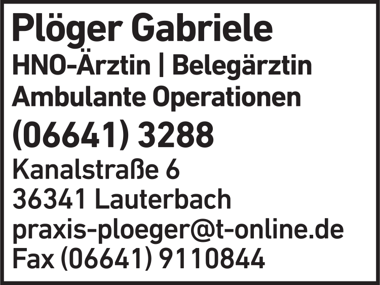 Plöger Gabriele Fachärztin f. HNO-Heilkunde u. Amb. Operationen 06641 32 88 Lauterbach Kanalstr. 6 36341