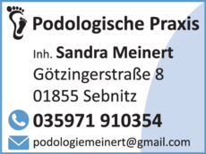 Podologische Praxis Sandra Meinert 035971 91 03 54 Sebnitz Götzingerstr. 8 01855 https://ies.v4all.de/0122/OETB/0230/7/8477/70308477_200x100px.png