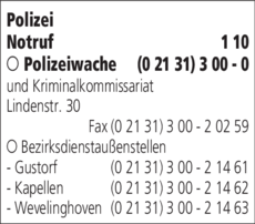Die Adresse von Polizei lautet: Lindenstr. 30, 41515 Grevenbroich