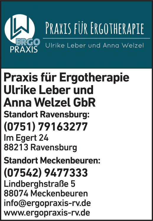 Die Adresse von Praxis für Ergotherapie Ulrike Leber ud Anna Welzel GbR lautet: Im Egert 24, 88213 Ravensburg